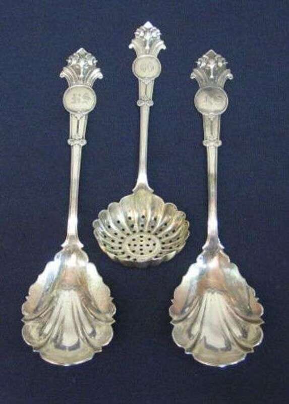 Comprising two serving spoons and a sugar sifter, each with ram's mask cast handles. 5 oz.