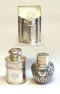 In the form of a knife box. H: 4 14 in. Together with a Victorian silver caddy, London 1895, with semi gadrooned and foliate embossed ovoid body. H: 3 1/2 in. Together with a third sterling silver caddy by W M. Wise & Sons. H: 4 1/4 in. 13 oz. (All in).