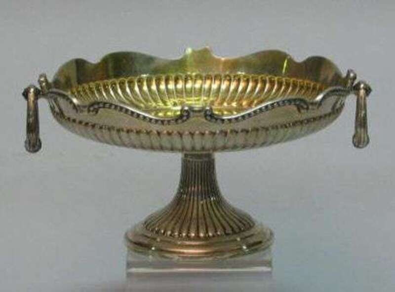 With twin reeded handles and gadrooned sides raised on a conforming socle base. H: 5, diam 9 in. 20 oz.