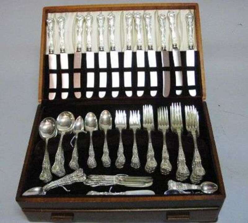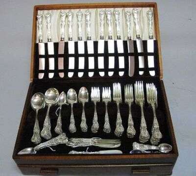 Comprising of 12 dinner forks, 12 dinner knives, 12 place forks, 12 place knives, 12 teaspoons, 12 grapefruit spoons, 12 salad forks, 12 demitasse spoons, 12 cream soup spoons, 12 butter knives, cake slice, carving knife and fork, 3 table spoons, cold meat fork, 139 pieces, 138 oz, together with a Dutch silver embossed spoon and fork.