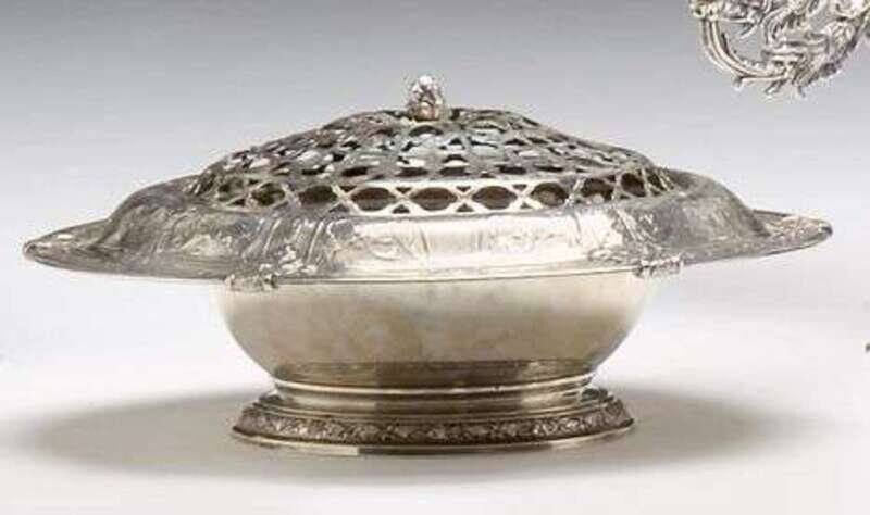 With a silver plated open scroll work cover, the rim embossed and chased with angels, birds, satyr masks and foliage, over plain sides, on a circular foot decorated with a band of leaves and acorns. H: 5, W: 13 in, 39 oz.