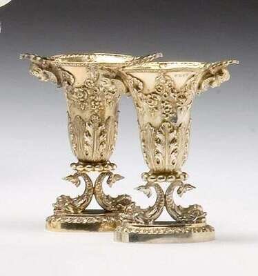 Of flared form, the sides embossed and chased with acanthus, drapery and foliate swags, flanked by two angel masks, raised on twin dolphin supports and oval bases with egg and dart molded edges. H: 7 3/4 in. 35 oz.