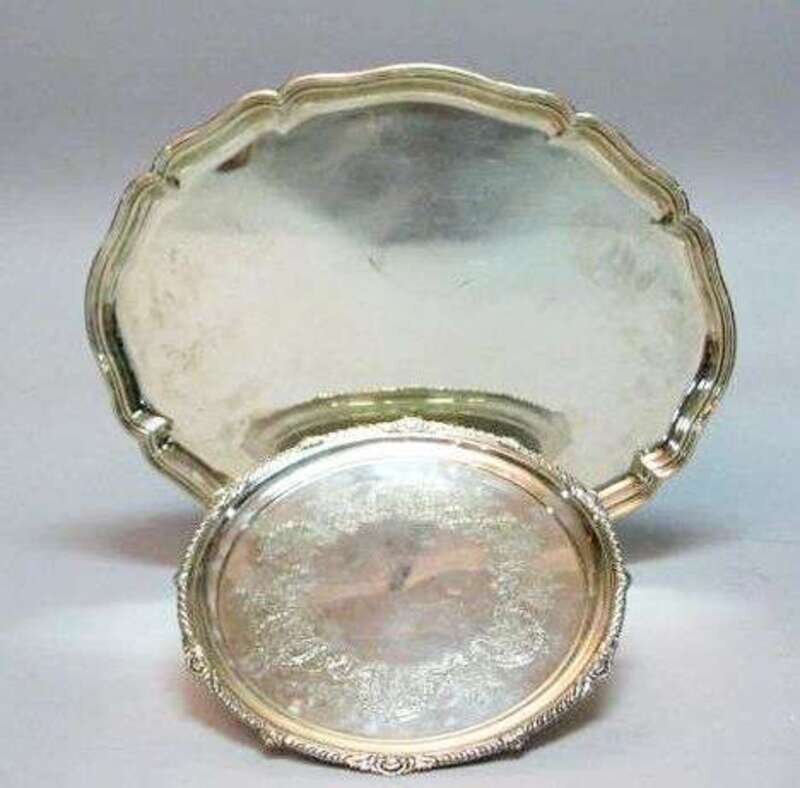 With a shell cast and gadrooned edge, centered by bright cut foliate decoration, on three squat bun feet. Diam: 12 1/2 in. 25 oz; together with a Continental oval silver tray, with a reeded serpentine edge, stamped 830. W: 20 in., 48 oz.