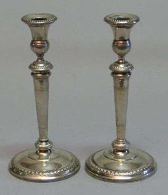Stamped 800, the stems and spreading circular foot decorated with egg & dart bands, weighted. H: 9 1/2 in.