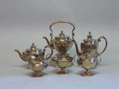 Consisting of a hexagonal urn-shaped coffee pot, tea pot, hot water pot and stand, covered sugar bowl, creamer and slop bowl, with urn finial lids and c-scroll handles. H: 13 in.