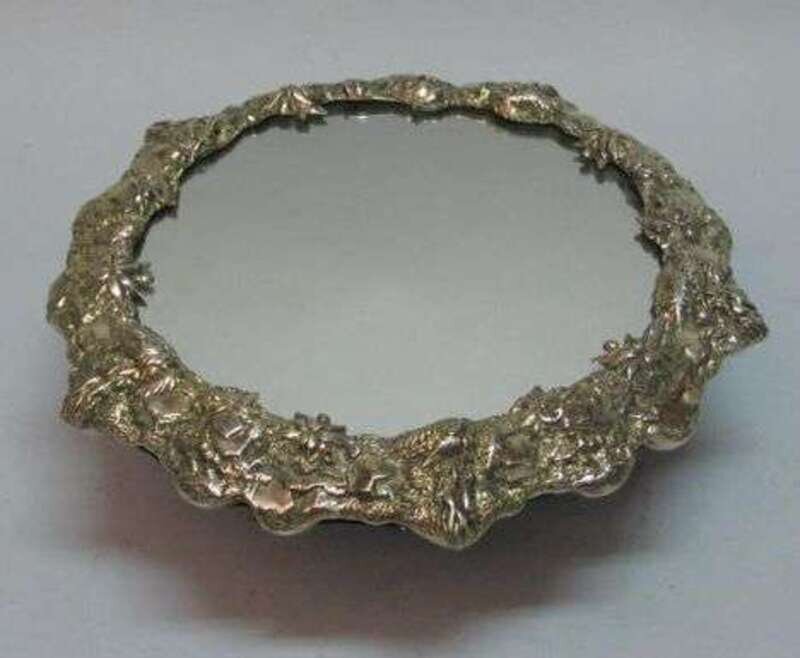 The circular mirrored panel within a naturalistic border, stamped Sterling Silver 925. Diam: 13 in.