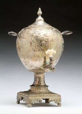 Maker's mark indistinct, the later lid with a flame finial, the ovoid sides with all over ornate repousse decoration with naturalistic twig handles and acanthus cast spout, with a ivory tap, on a conforming square gadrooned base and four claw bracket feet. H: 19 in, 93 oz (including later cover).