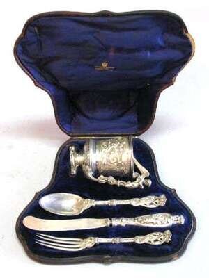 Renaissance revival four piece silver christening set Francis Higgins, London 1873