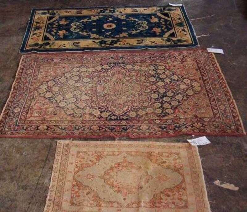 Chinese rug, c. 1900, 4.4 x 2.7 ft., Tabriz mat, c. late 19th c., 2.5 x 1.9 ft. and Kermanshah rug, southeast Persia, 4.6 x 3 ft.