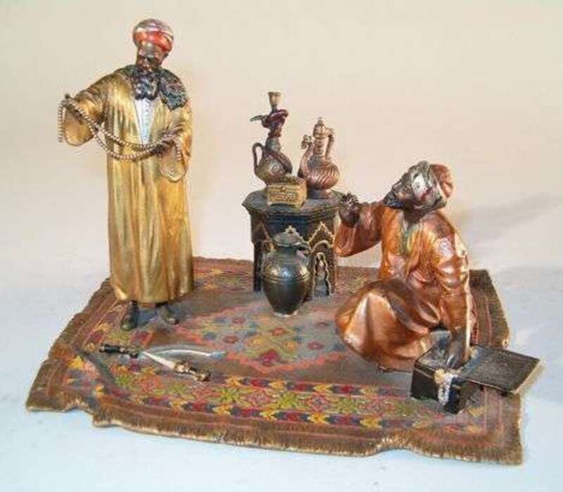Depicting two Arab traders on an Oriental rug with a jewel box and small table. H: 6 in.