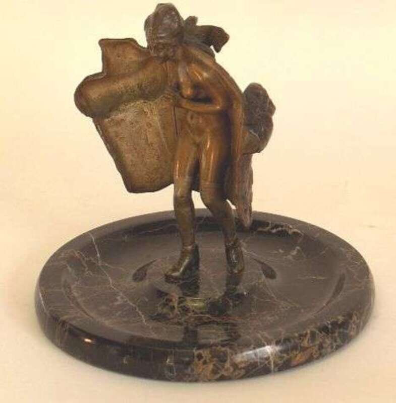 Modeled as a lady in a fur coat and stockings, opening to reveal her nude, raised on a dished circular marble base. H: 7 1/4 in.