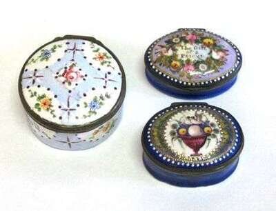 Three Staffordshire enamel snuff boxes 18th c.