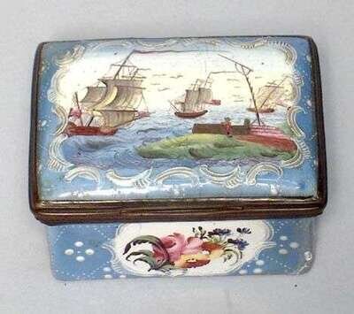 The hinged lid painted with three clippers of the coast, the sides painted with reserves of flowers, on a pale blue 'jeweled' and scroll white enamel decoration. W: 2 1/2 in.