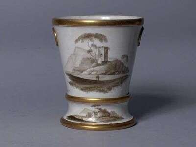 With gilt bands and loop handles, the sides painted in sepia with figures by castle ruins, the base painted with a cottage and figures in a mountainous landscape. H: 6 1/2 in.