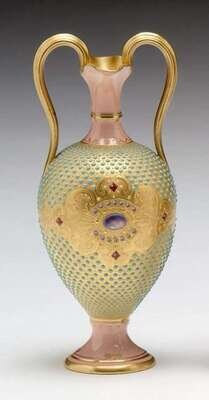 The flared neck with twin scroll handles, the ovoid sides with turquoise and colored enamel "jeweled" decoration on a gilt ground, raised on a pedestal foot, green printed marks. H: 7 /4 in.