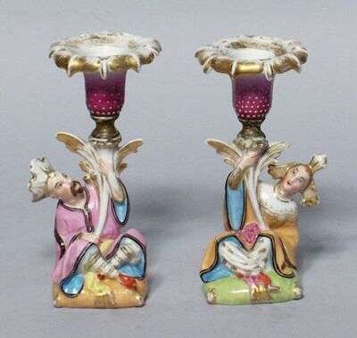 In the manner of Jacob Petit, In the Oriental taste, the seated figural stems holding cornucopia surmounted by jeweled candle nozzles. H: 7 in.