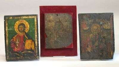 Two Russian Icons together with a Mexican Retablo on Tin 18th / 19th c.