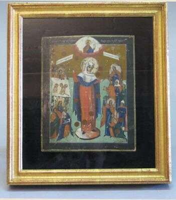 Painted in polychrome with the Mother of God and saints, framed. H: 8 1/2, W: 7 in.