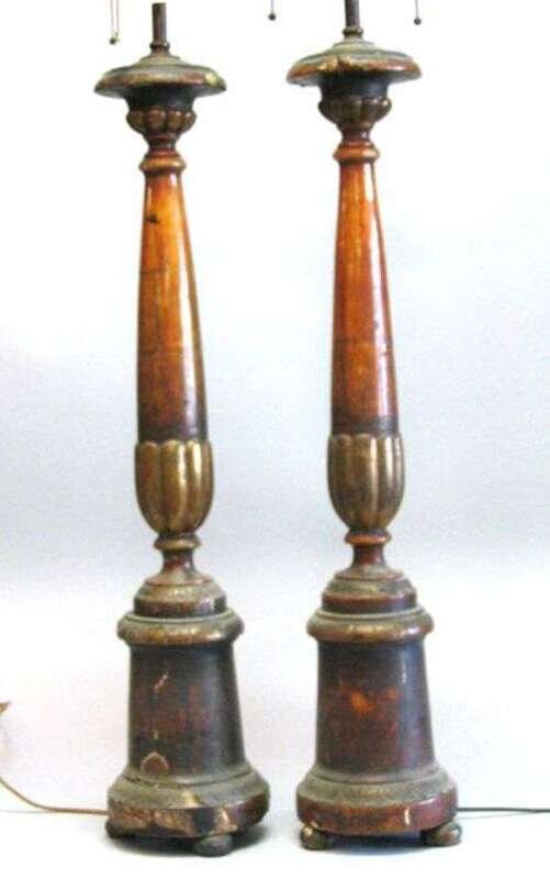 With turned lobed stems, on cylindrical base with squat bun feet. H: 33, H: 45 1/2 in. (including fitting).