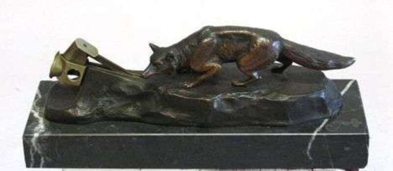 In the form of a fox standing on a rock work base, mounted on a rectangular marble base. W: 9 3/4 in.