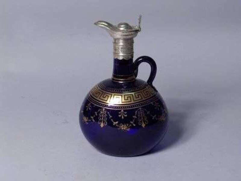 The silver plated hinged lid enclosing a stopper, ovoid sides with a scroll handle and decorated in gilt with a Greek key band and foliate swags. H: 8 1/2 in.