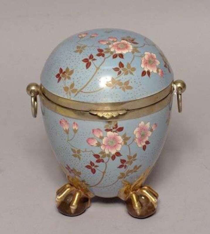 Possibly Minton, with silver plated mounts, the hinged lid and sides painted with pink flowers and foliage on a turquoise ground, on three claw and ball feet, indistinct impressed mark. H: 7 3/4 in.