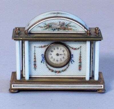 The temple form case decorated with birds and foliate swags, raised on toupie feet. H: 3 in.
