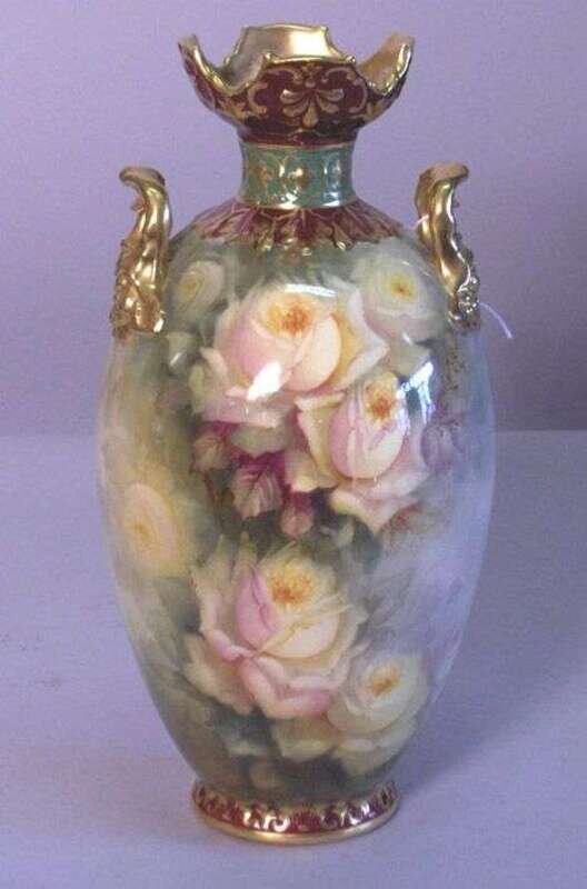 Signed F. Muller, the sides painted with roses and with twin scroll handles, printed crown mark. H: 12 in.