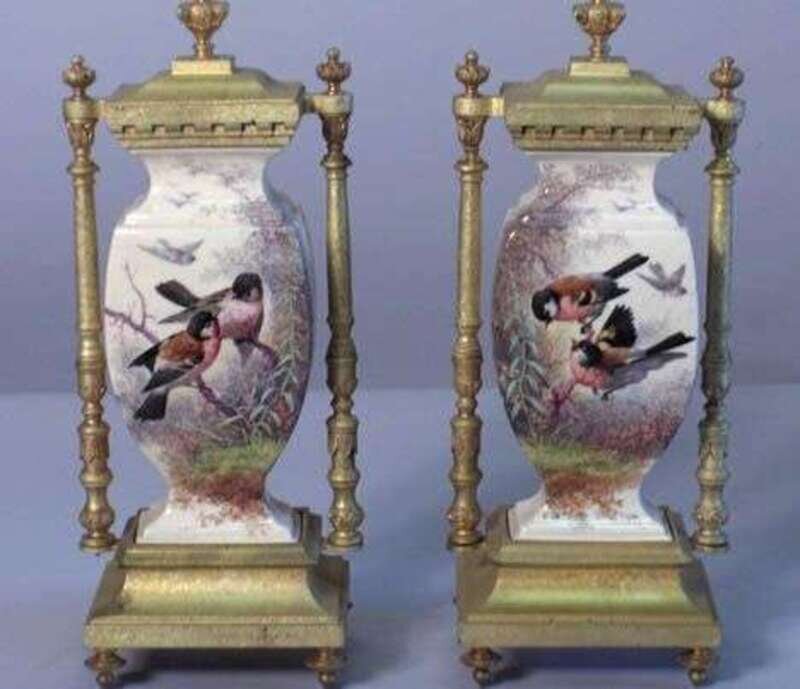 The sides painted with chaffinch's, insects and foliage, raised on toupie feet. H: 10 1/2 in.