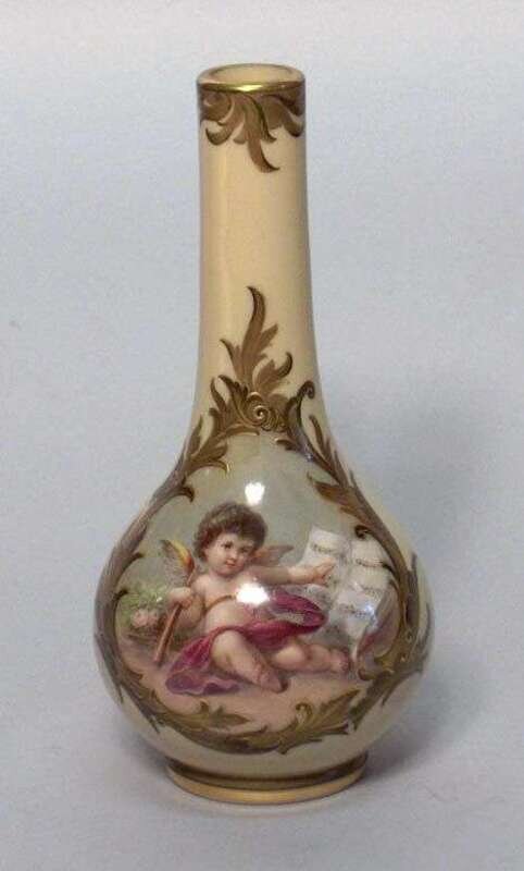 Painted with a winged cherub within an ornate gilt border, on a cream ground. H: 9 1/2 in.