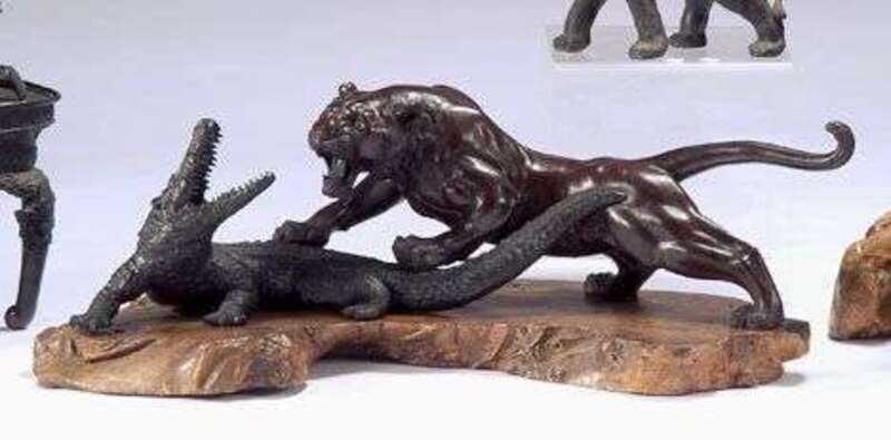 Modeled as a tiger attacking an alligator, wood base.