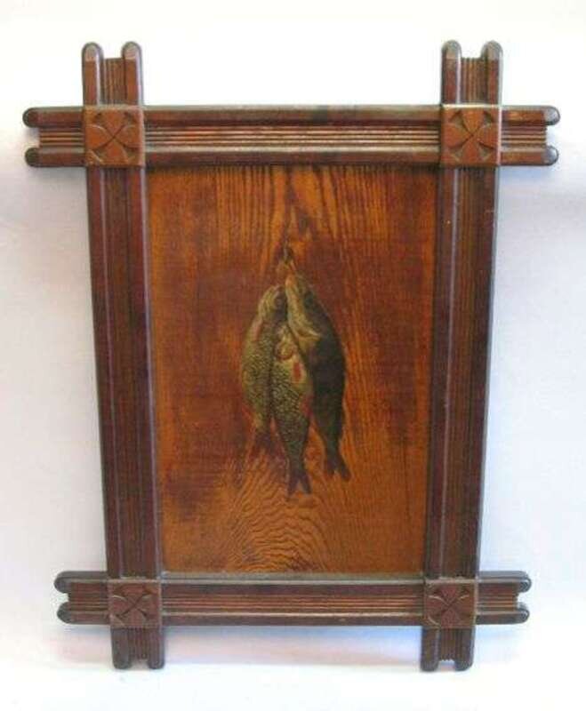 Painted with dead game and fish in reeded walnut "gothic" style frames. H: 35, W: 26 1/2 in.