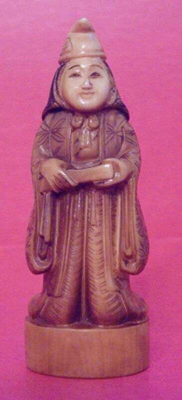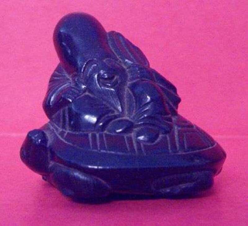 Depicting a wood figure of Jurojin seated upon the back of a tortise. Unsigned.