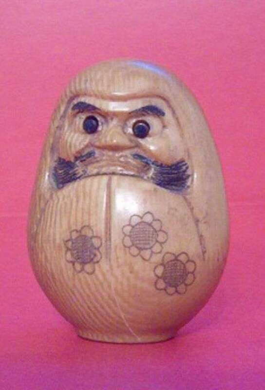 Depicting a wood figure of Daruma with sunflower motif on his robe and moveable protruding eyes. Signed, Ogen.