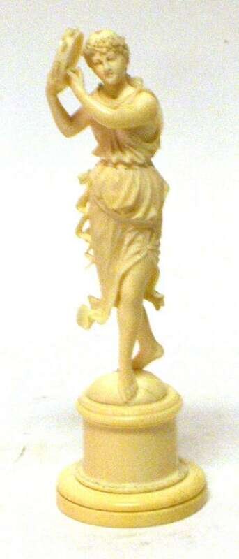 Depicting a classical dancing female playing a tambourine raised on a turned ivory base. H: 7 1/2 in.