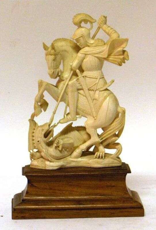 Depicting St. George and the dragon, raised on a later wood base. H: 8 1/4 in.