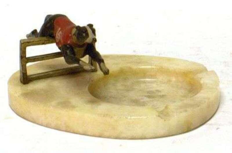 Modeled as a hurdling greyhound, mounted on an onyx ashtray. W: 7 1/2 in.
