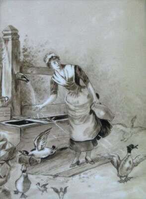 Painted with a farm girl and ducks, impressed KPM sceptre mark. H: 8 5/8, W: 6 1/4 in.
