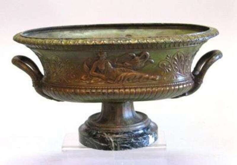 Of boat shape form, the sides decorated in relief with draped females, swans and palmettes with twin handles, on a marble base. H: 8 1/2, W: 16 1/2 in.