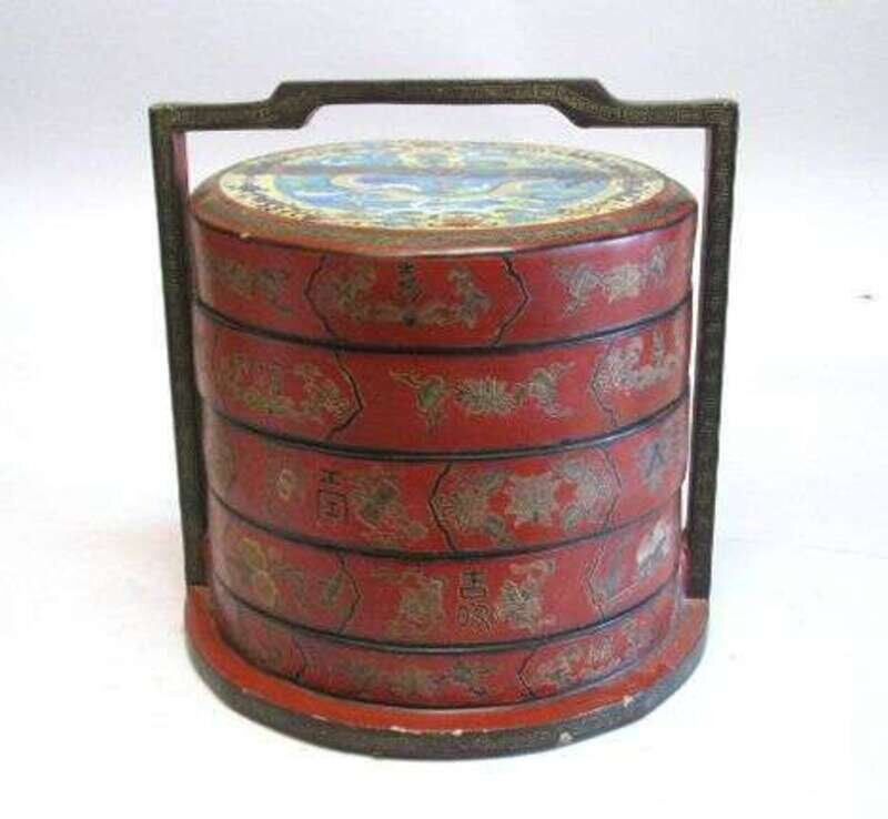 The enameled top decorated with a dragon and scrolls, the sectional sides decorated with foliage. H: 15 1/2, W: 14 1/2 in.