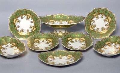 Comprising oval compote, two small oval dishes and two larger, six plates and two deep dishes, each with shaped gilt enhanced green borders, puce printed mark. Compote H: 5 1/4, W: 14 in, plates Diam: 9 1/4 in. (13).