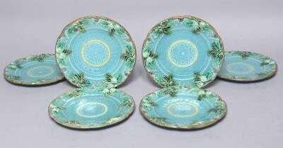 The lattice borders molded in relief with strawberries and flowers, on a turquoise ground, impressed Sarreguemines, majolica. W: 8 in.