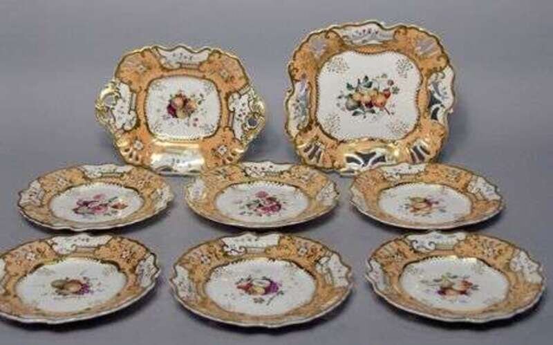 Comprising a large square dish, oblong handled dish and 6 plates, each finely painted with floral boquets of fruit, within reticulated apricot borders and floral painted reserves. Plates D: 9 in. (8).