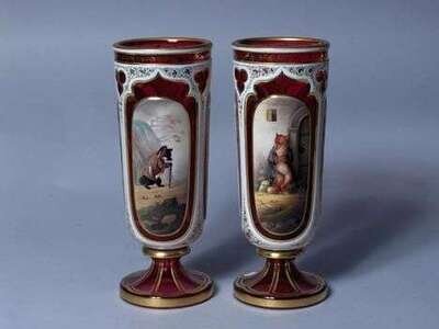 With finely paintred reserves of flowers and centrally decorated with two reserves depicting foxes in human attire. H: 10 in.