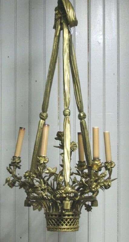 In the form of flowering baskets, supported by ribbon tied drapery. H: 42 in.