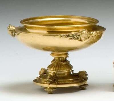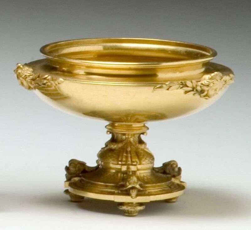 The sides applied with mask motifs, raised on an ornate circular base with dolphin cast motif, ending in laurel wreath toupie feet, stamped Christofle. H: 6, D: 8 1/2 in.