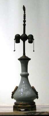 Mounted as a lamp, of Chinese form, the sides painted and hand tooled in white slip with vine leaves, applied with gilt bronze laurel wreath handles and a shaped square base. H: 11 1/2 approx. H: 28 in (all in).