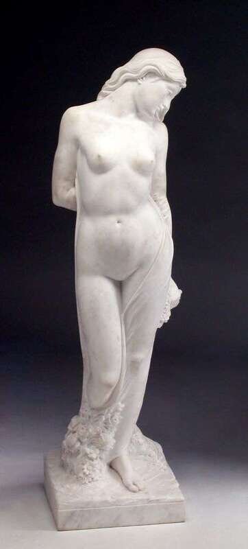 Modeled as a semi-nude draped beauty holding a bouquet of flowers square base. H: 53 in.