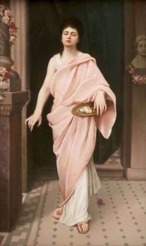 Painted with a young beauty wearing a Grecian style gown and pink wrap in a stately rose draped interior with mosaic floor, in an ornate carved gilt wood frame, impressed KPM and sceptre mark. H: 13, W: 7 1/2 in.