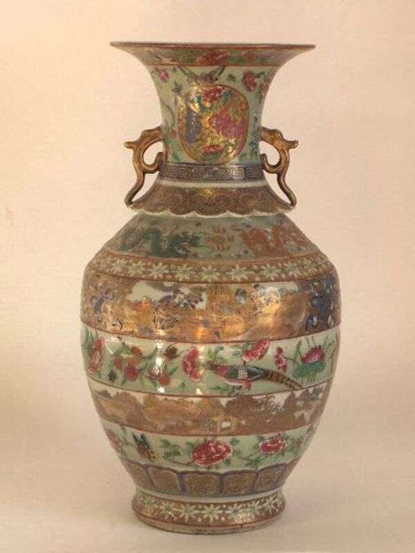 Of baluster form with a scalloped neck and stylized dragon form handles, decorated with successive registers depicting dragons, landscape, figural scenes and finely enamelled birds and butterflies. H: 16 3/8 in.